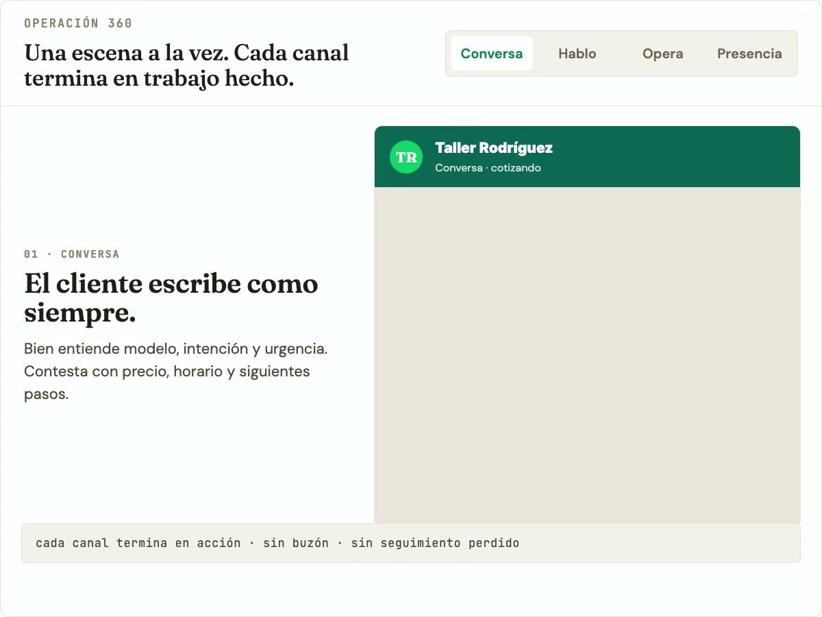 Conversa recibe clientes por mensajes. Hablo contesta llamadas. Opera ejecuta trabajo interno. Presencia instala, entrena y revisa contigo. Un sistema 360 para negocios mexicanos.